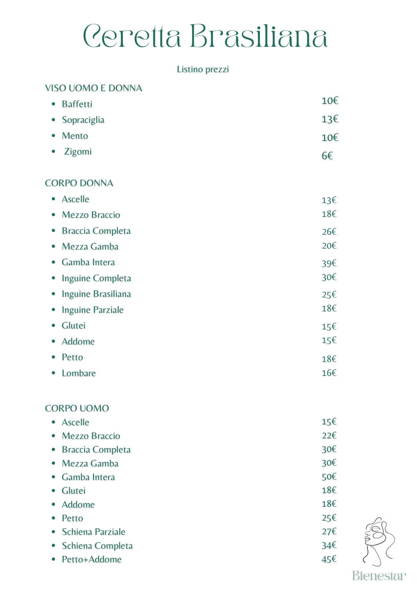 Tra le zone trattabili trovi viso (labbro superiore, mento, basette), ascelle, braccia, inguine (classico, brasiliano, totale), gambe parziali o complete, schiena, petto, addome, spalle, glutei e aree localizzate.